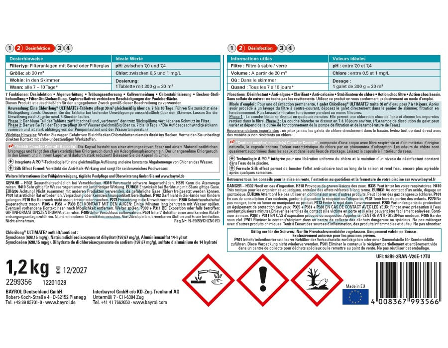 Funktion des Produkts: Dauerdesinfektion. Chlorilong® ULTIMATE7 ist eine 7 Funktionen- Chlortablette (300 g) bestehend aus zwei Phasen mit unterschiedlichen Wirkungsweisen: Der blaue Teil zerfällt in etwa 10 Minuten und lagert sich auf dem Filterbett