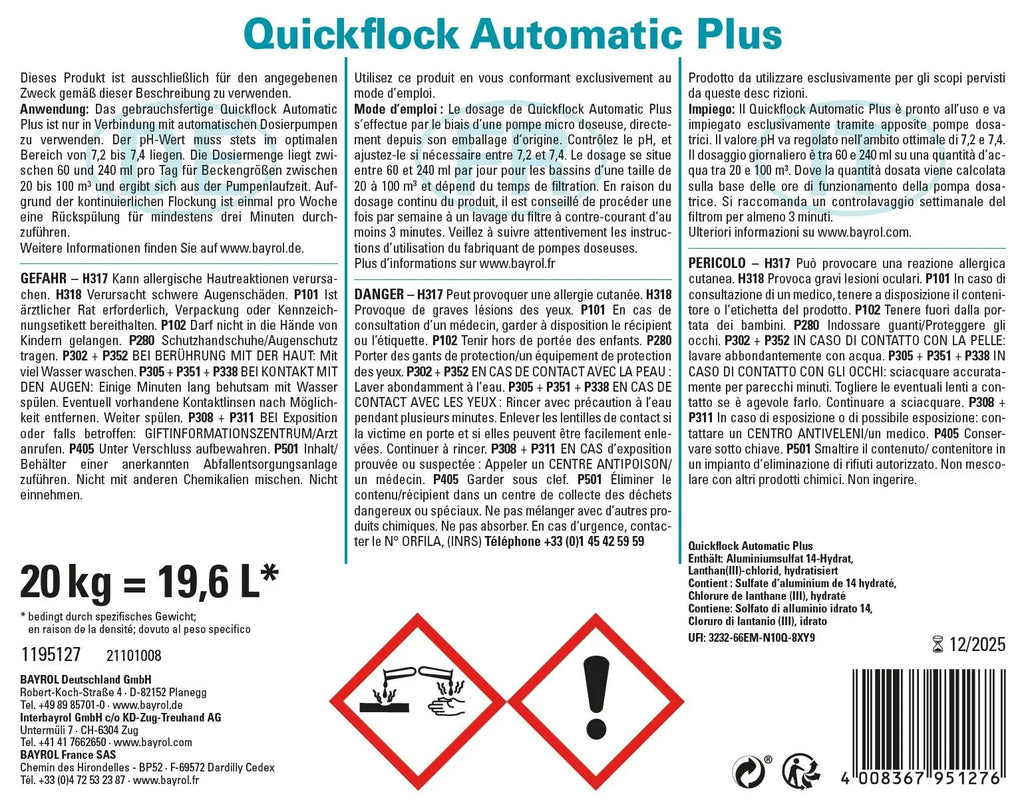 Quickflock Automatic Plus ist ein hochkonzentriertes Flockmittelkonzentrat für Sandfilter, das speziell für private Schwimmbäder in Kombination mit dem BAYROL Flockmatic-System entwickelt wurde. Durch die kontinuierliche Flockung werden selbst feinste Schwebeteilchen entfernt, die Wasserqualität verbessert und die Wirksamkeit des Desinfektionsmittels unterstützt. Zusätzlich enthält das Produkt ein schaumfreies Algizid, das Algenwachstum effektiv vorbeugt.