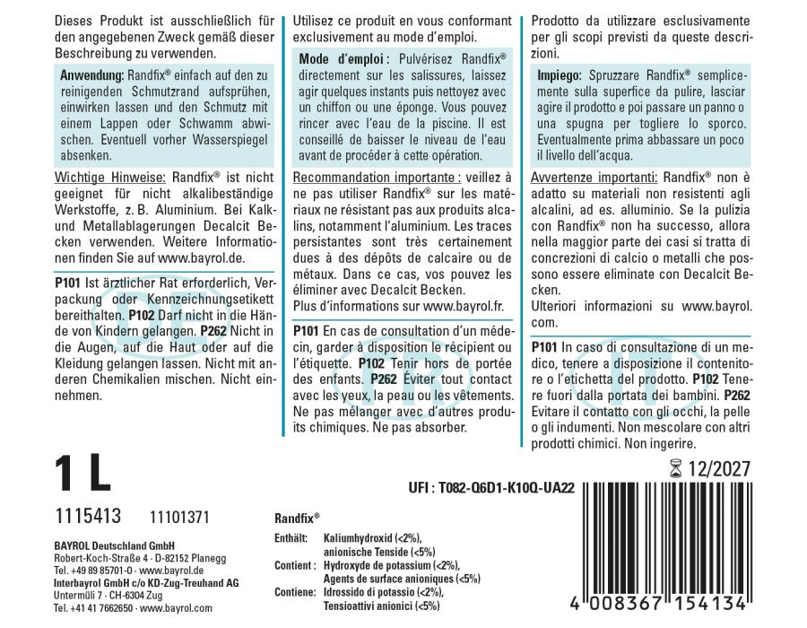 Randfix ist ein hochwirksamer Spezialreiniger, der Schmutz-, Fett- und Russränder an der Wasserlinie mühelos entfernt. Dank seiner dickflüssigen Rezeptur haftet er optimal auf senkrechten Flächen wie Beckenwänden und Skimmern, wodurch die Reinigungswirkung maximiert wird. Die praktische Sprühflasche sorgt für eine einfache und gezielte Anwendung.
